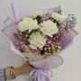 На фото букет из 5 гвоздик и гипсофилы. В составе: гвоздика 5 шт, гипсофила 2 шт, крафт-бумага 1 шт, атласная лента 1 шт, . Все цветы свежие и ароматные, букет красиво оформлен и отлично подходит для подарка. Доступна доставка цветов или самовывоз.