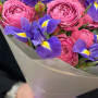 Букет из розовых пионовидных роз и синих ирисов в Сланцах