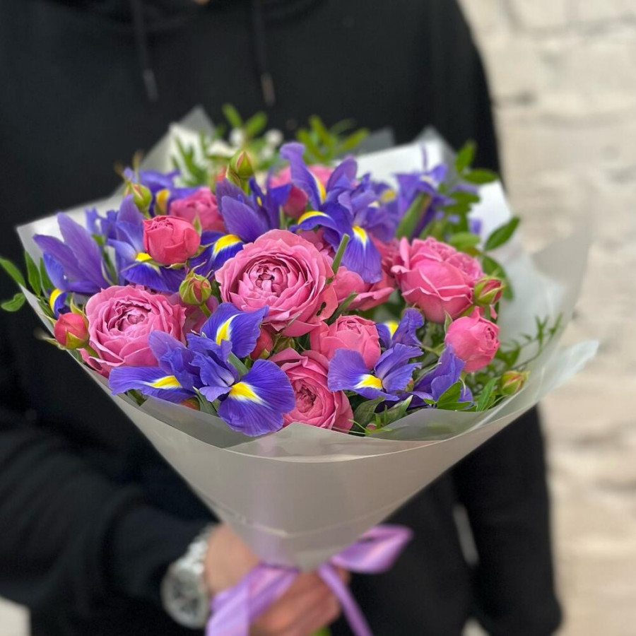 На фото букет из розовых пионовидных роз и синих ирисов. В составе: кустовая пионовидная роза 3 шт, ирис 7 шт, писташ 5 шт, дизайнерская упаковка 1 шт, атласная лента 1 шт, . Все цветы свежие и ароматные, букет красиво оформлен и отлично подходит для подарка. Доступна доставка цветов или самовывоз.