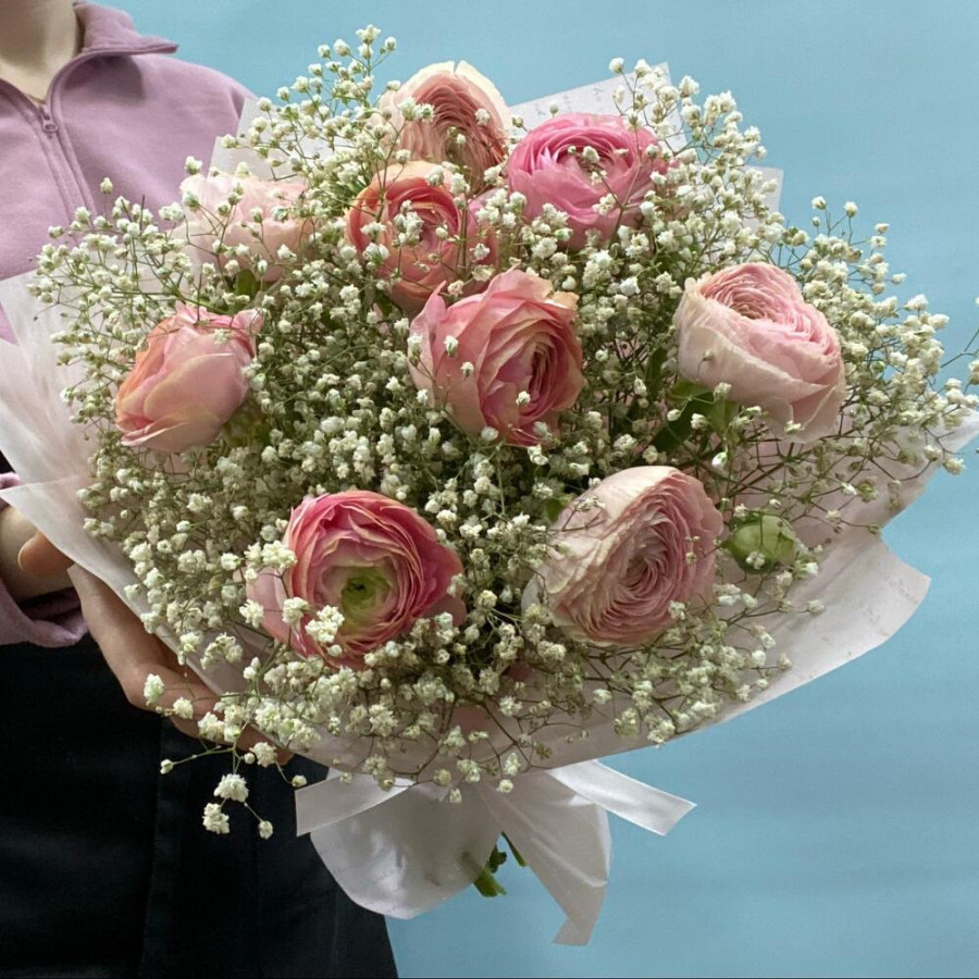 Букет из розовых ранункулюсов с белой гипсофилой в Сланцах